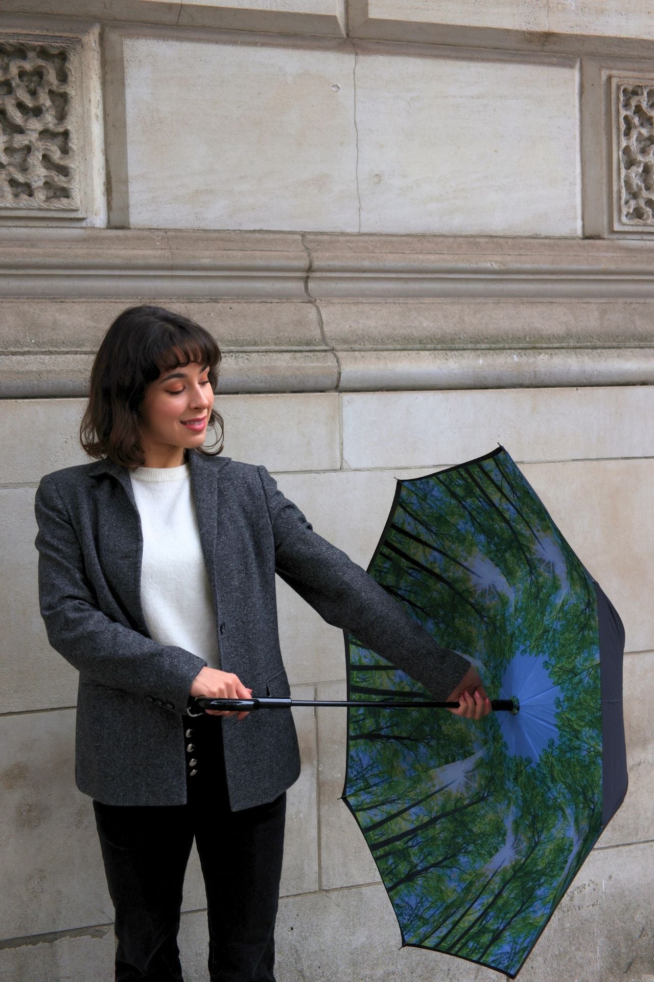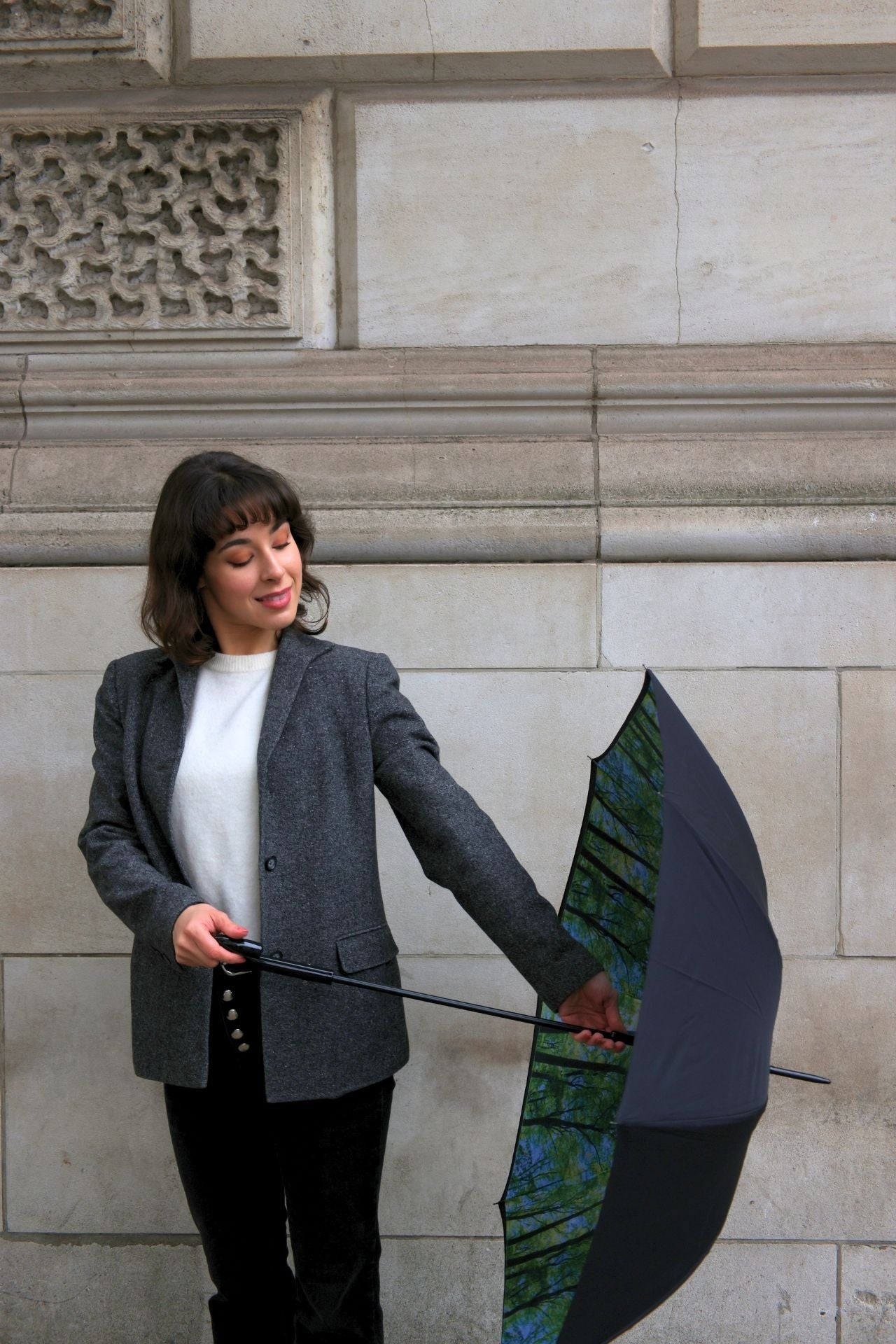 - Plain black outer canopy with elegant print inside