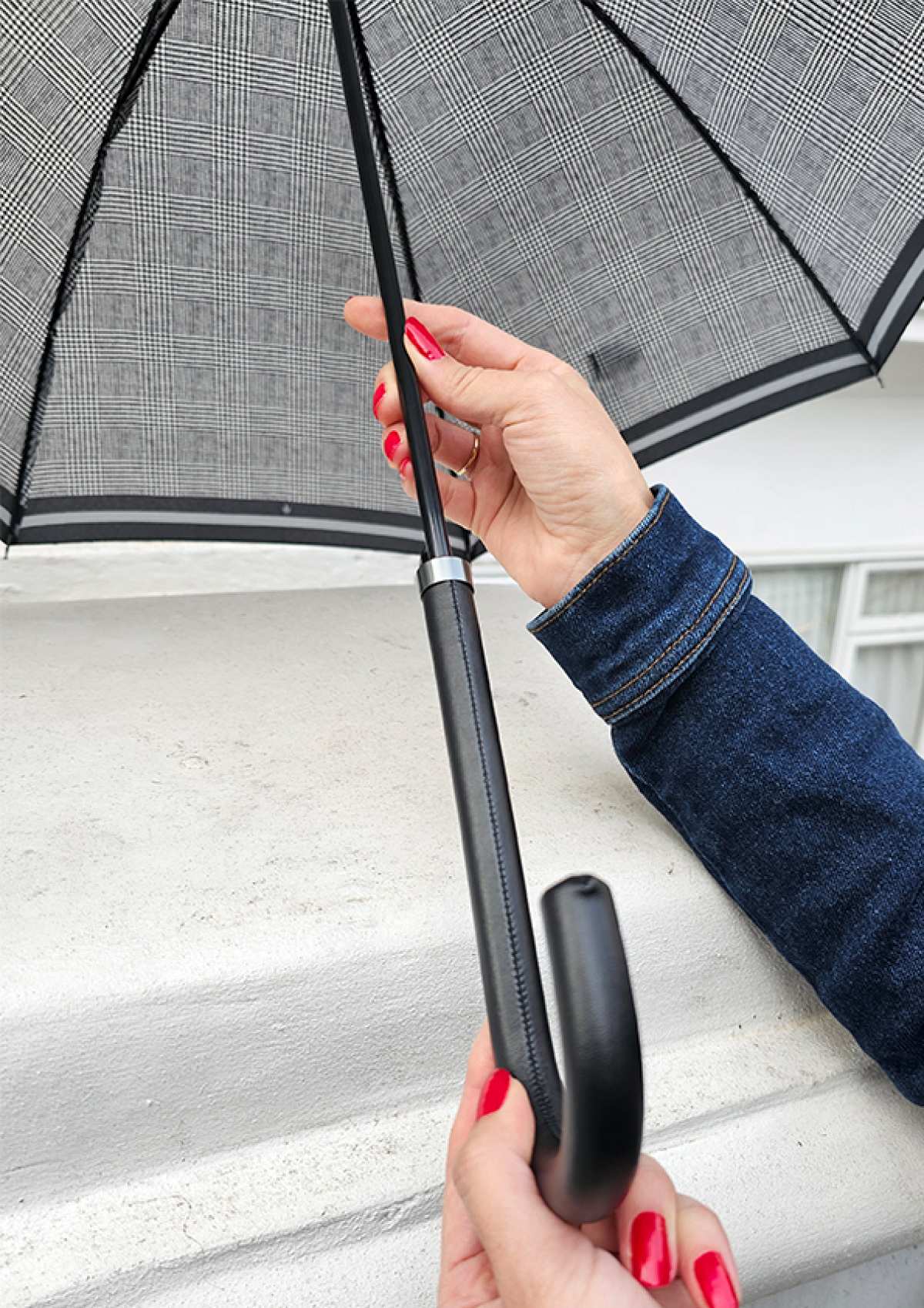 A stylish walking umbrella that opens at the touch of a button
